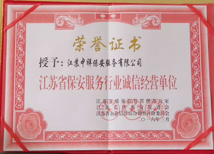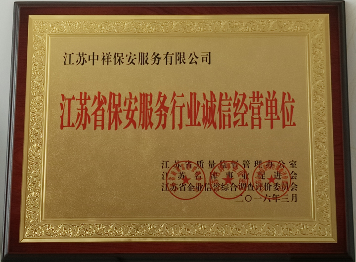 江蘇中祥保安公司榮獲江蘇省保安服務行業(yè)誠信經(jīng)營單位