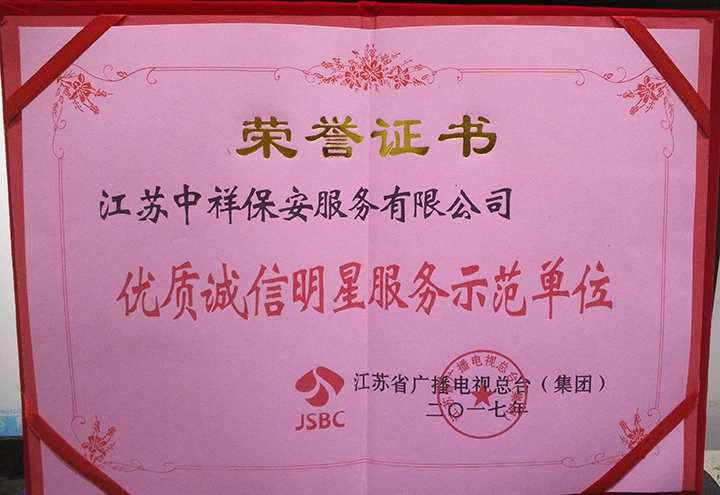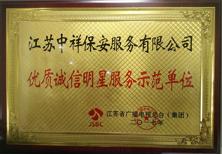 中祥保安公司榮獲江蘇省廣播電視總臺2017年優(yōu)質(zhì)誠信明星服務示范單位
